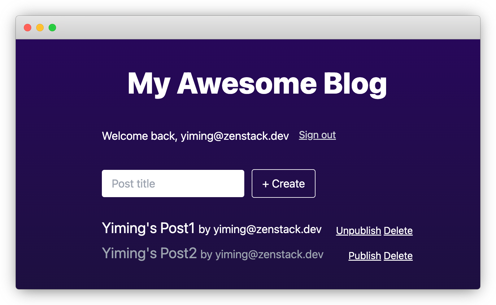 Now, open a new incognito window and sign up a new account emily@zenstack.dev. "Post1" should appear in her list, since our access policy allows all users to read published posts.